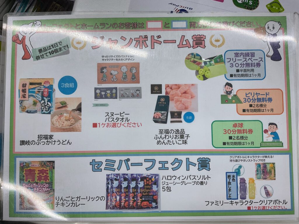 ジャンボドーム賞はホームランを打った方、1階のパーフェクトシリーズでパーフエクトを出した方にプレゼント🎁