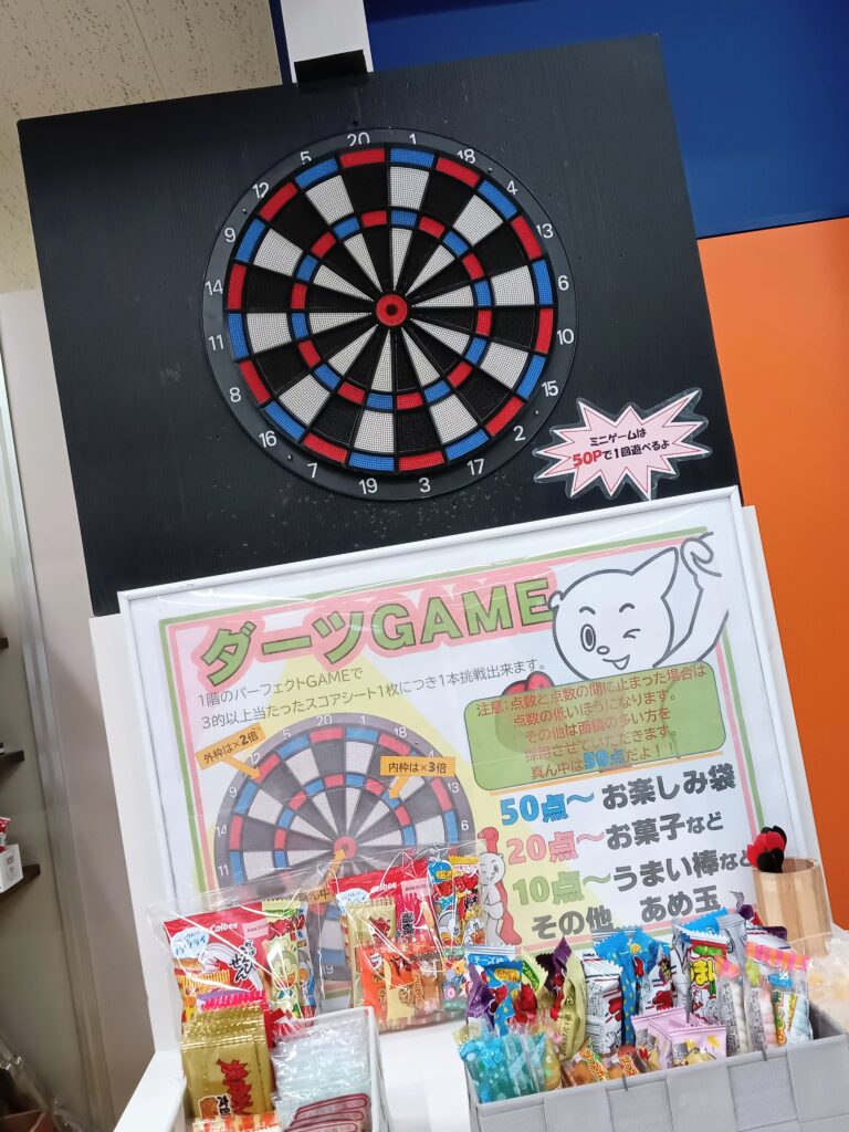 ダーツの矢を投げて的の刺さった場所の点数に応じてもらえる景品が変わります!