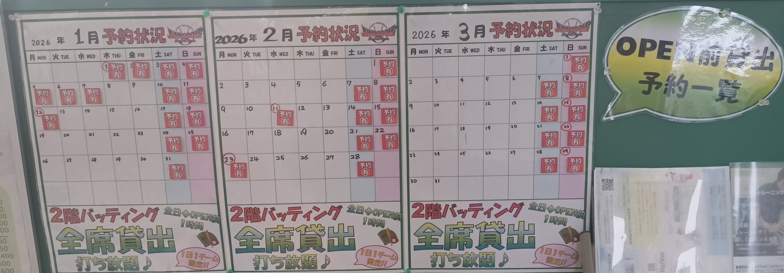 早朝バッティングの貸出状況と明日元旦のイベントを少々ご案内します